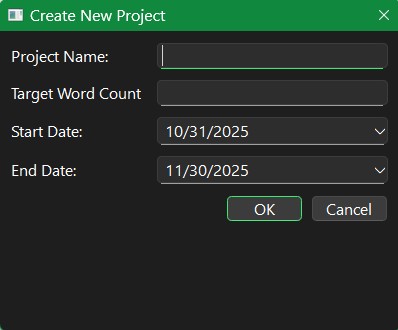 Enter your project title and how many words you are aiming for. Then use the provided calendar for start and end dates. Press OK or hit enter.