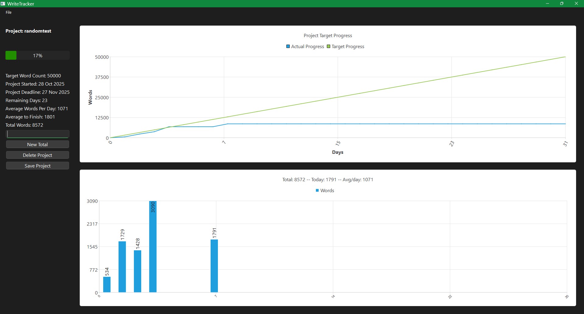 The line chart will provide you with total words against a target line. (Which is the original average required to finish before your first input). You can hover over the line and see what total was reached on what date.